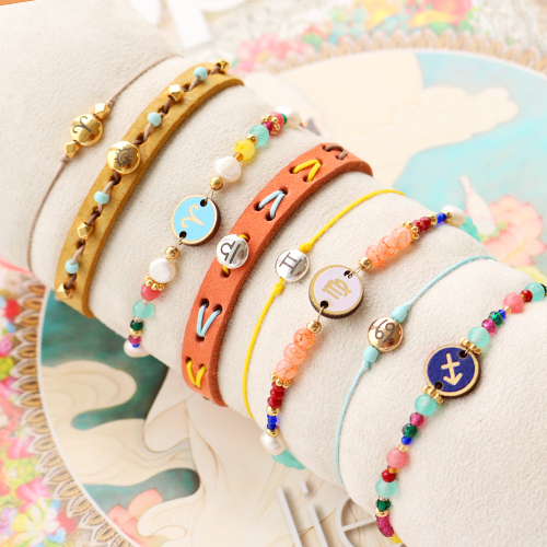 Con le nuovissime perline zodiacali di metallo DQ puoi realizzare diverse creazioni originali. Puoi ad esempio decorare un bracciali Cuoio® in cuoio con un coda di topo (macramè) di diversi colori con al centro una perlina zodiacale per un tocco d’effetto. Infilando il cordoncino nei fori in diversi modi o avvolgendo il cordoncino tutto intorno al bracciale ottieni un effetto colorato e vivace. Ovviamente, sul cordoncino puoi infilare anche altre piccole rocaille o perline di metallo DQ. Alle perline di metallo DQ puoi abbinare anche i componenti per orecchini di metallo DQ e le perline di conchiglia cilindriche. Infila le perline su un gancetto e crea un divertente ciondolo. Appendilo all’occhiello del componente per orecchini ed ecco pronti i tuoi orecchini!