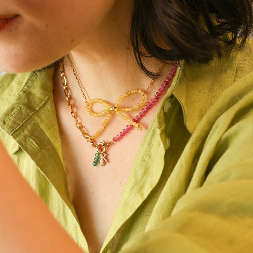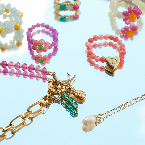 Questa nuova collezione di perline in pietra naturale offre una bellissima varietà di colori. Le perline sono incorporate in anelli e collane con motivi floreali e forme di fiocco. Combina filo elastico, perline miyuki, perle e ciondoli iniziali per anelli giocosi, o crea collane eleganti con catena a rolò, ciondoli in acciaio inossidabile, iniziali e strati di catena a rolò.