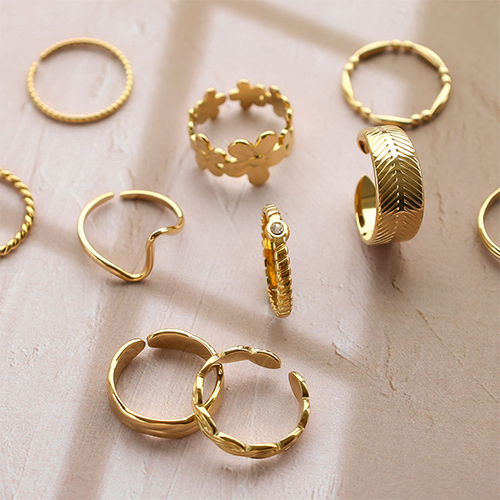 Questa pratica gamma di anelli in acciaio inossidabile è composta da anelli con disegni diversi, come un fiore e un cuore. Tutti gli anelli sono disponibili in oro e argento e sono regolabili. Una serie bellissima da aggiungere alla tua collezione di gioielli!
