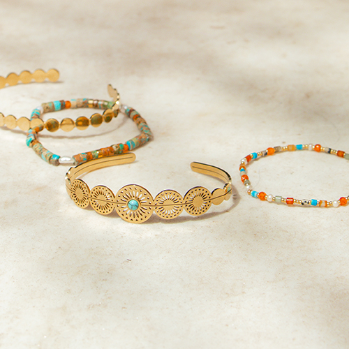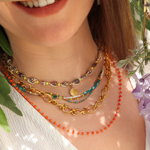 Questo bellissimo look estivo è molto in voga quest'estate. Crea collane di varie lunghezze da indossare contemporaneamente. Combina le catene a rolò con collane fatte a mano di perline di conchiglia ciprea. I gioielli con perline di conchiglia o ciondoli a tema spiaggia non dovrebbero mancare quest'estate. Per i bracciali, puoi scegliere tra quelli già pronti e abbinarli a un bracciale di perline in pietra naturale colorata. Crea orecchini coordinati con ciondoli e perline nelle stesse tonalità delle collane e dei bracciali per dei bellissimi set!