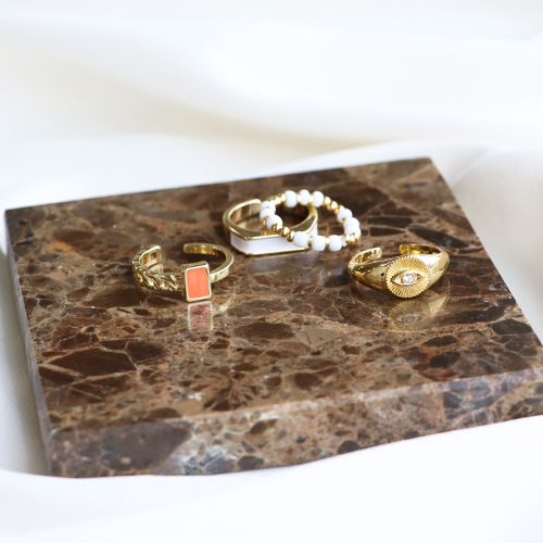Questi anelli in ottone smaltati, in oro e argento, sono spiritosi da indossare, assieme agli anelli fatti a mano. Crea il tuo anello combinando, ad esempio perline rocailles, perline sfaccettate e perline in metallo DQ. Infilale sul filo di nylon o elastico e completa l’anello con un nodo e una goccia di colla. Usa un tappetino per perline quando utilizzi perline piccole.