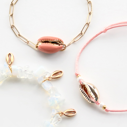 Pensando all’estate, subito vengono in mente il sole, il mare, la spiaggia... e ovviamente le conchiglie! Per questo è sempre un piacere usare perline a forma di conchiglia quando si realizza bigiotteria estiva. Con conchiglie ciprea, cordoncino macramè o cordoncino cerato puoi facilmente annodare o intrecciare una collana o singoli fili. Per un colorato tocco extra, puoi aggiungere diverse perline, di cocco, rocaille o di metallo DQ, annodandole o intrecciandole in mezzo. Preferisci i bracciali con l'elastico? Infila allora su un cordoncino elastico un mix di perline di conchiglia, perline di metallo DQ, perline di cocco e perline di vetro. Anche con i chip di pietra dura e i ciondoli in metallo DQ puoi realizzare creazioni strepitose! Crea un set completo e realizza orecchini coordinati infilando perline e ciondoli su orecchini a cerchio o infila ad esempio perline di conchiglia ciprea su un cordoncino cerato e fissalo a un orecchino a monachella.