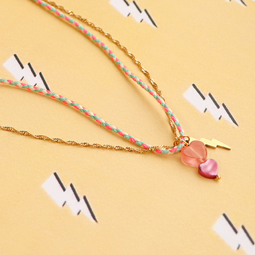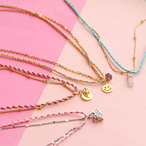 Con questo cordino colorato puoi facilmente creare una collana da indossare anche come doppio bracciale o cavigliera. Combina il cordino con la catena a rolò e appendi un ciondolo nella parte inferiore. Usa i ciondoli dell'assortimento o crea i tuoi con le tue perline preferite. Appendi il ciondolo su entrambe le collane in modo che stiano bene l'una accanto all'altra. Completa la tua creazione con terminali, chiusure e allungatrici.